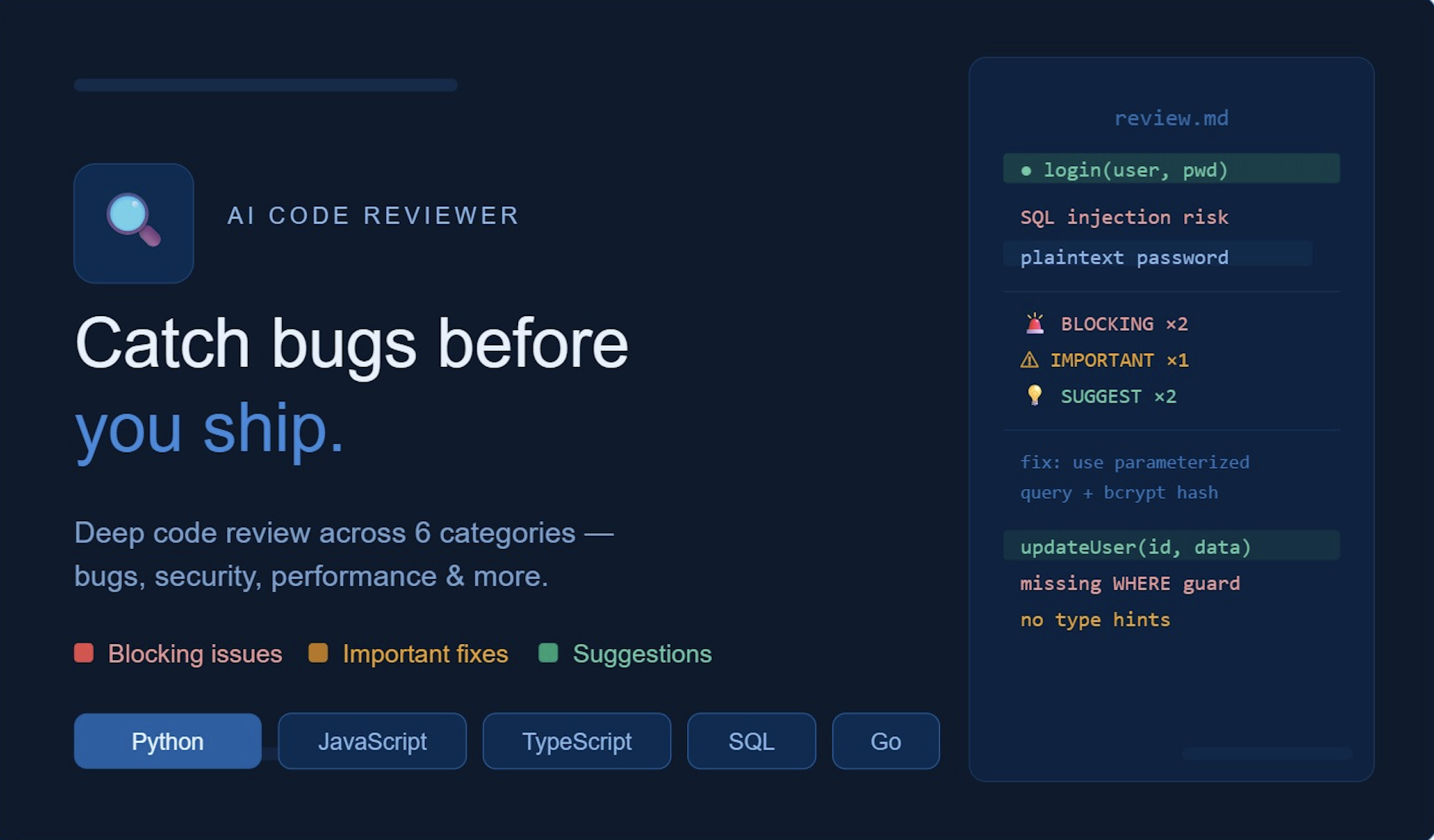 AI Code ReviewerEngineeringSkill$12Your AI catches the bugs. You ship the fix.EngineeringNone — this is an instruction-only skill - No API keys required - No binaries to install - No environment variables needed - Just drop the files into your OpenClaw workspace and start reviewingViewBuy