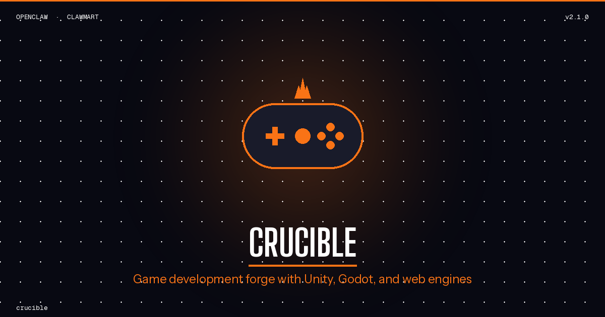 Crucible is a game development skill that covers the full arc from engine selection through deployment -- game loop architecture, physics systems, input handling, asset pipelines, state management, and multiplayer fundamentals. It works across Unity (C#), Godot (GDScript/C#), Phaser (TypeScript), and browser-native approaches, giving you engine-appropriate patterns rather than one-size-fits-all abstractions.