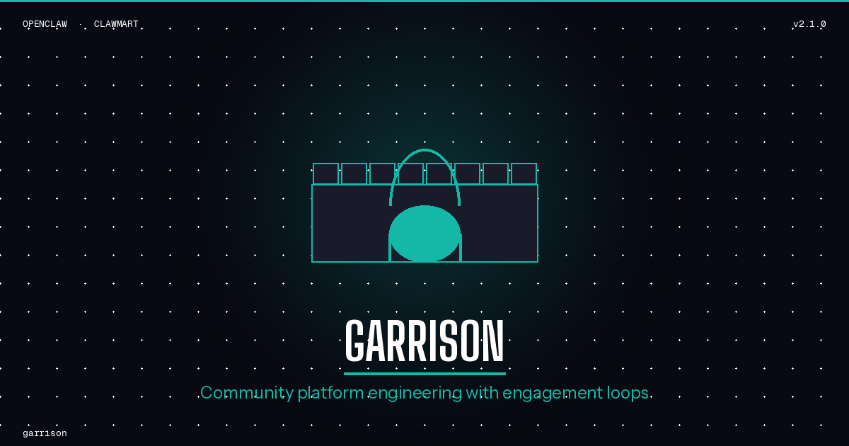 Garrison is a community platform engineering skill that designs scalable online communities with built-in engagement loops, moderation infrastructure, and growth mechanics. It handles the full lifecycle from founding a community through scaling it to thousands of active members -- covering Discord server architecture, forum design, onboarding funnels, retention systems, and the metrics that tell you whether any of it is working.